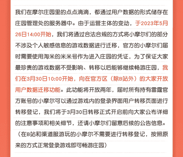 合作结束本就是开发方和代理方双方的事情,,,,降低这件事情对玩家的影响,,才是对所有珍视这段童年的摩尔玩家最好的呵护。。目前看来,,,,用户完全不用担心后续因无法登录游戏而造成任何数据上的损失,,只要及时进行账号转移,,,,就可以好好保留、、、、延续在庄园的痕迹和回忆,,继续在庄园里做快乐的红鼻子小鼹鼠。。