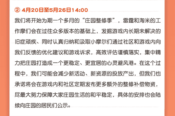 合作的结束并不意味着这个童年IP的结束,,对于《摩尔庄园》手游而言,,这是一个新阶段的开始。。后续游戏内将开启庄园重构计划,,,,会就以往遗留下来的BUG进行集中修复,,并在游戏内和社区定期发布更多补偿物资。。