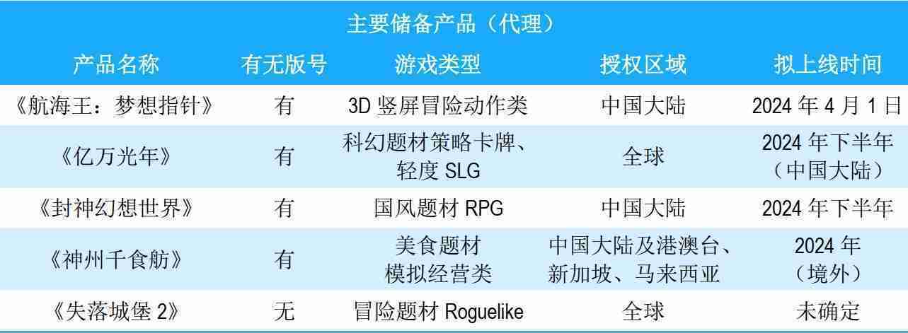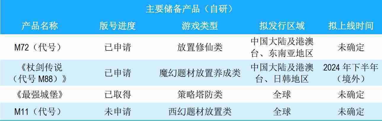 公司储备的多个自研、、、代理产品都在有序推进当中,,,,涵盖放置类、、策略类、、、模拟经营类、、、RPG、、、Roguelike等多元化游戏品类,,,,储备的主要自研和代理产品如下::