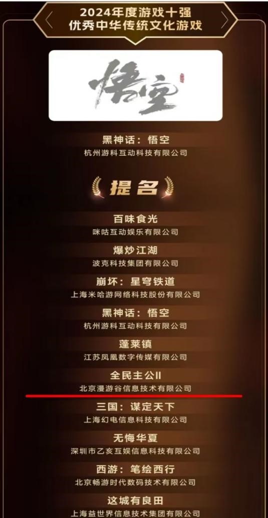 在2024年度备受瞩目的游戏界盛会上,,年度“游戏十强”榜单终于揭晓。。。经过一系列激烈的竞争和严格的评审流程,,,公司产品《全民主公II》凭借其卓越的游戏品质和庞大的玩家基础,,,荣获“2024优秀中华传统文化游戏”提名。。。。此奖项被誉为“第九艺术封神榜”,,,因其突出的影响力、、、、公信力成为中国游戏产业最高奖项。。
